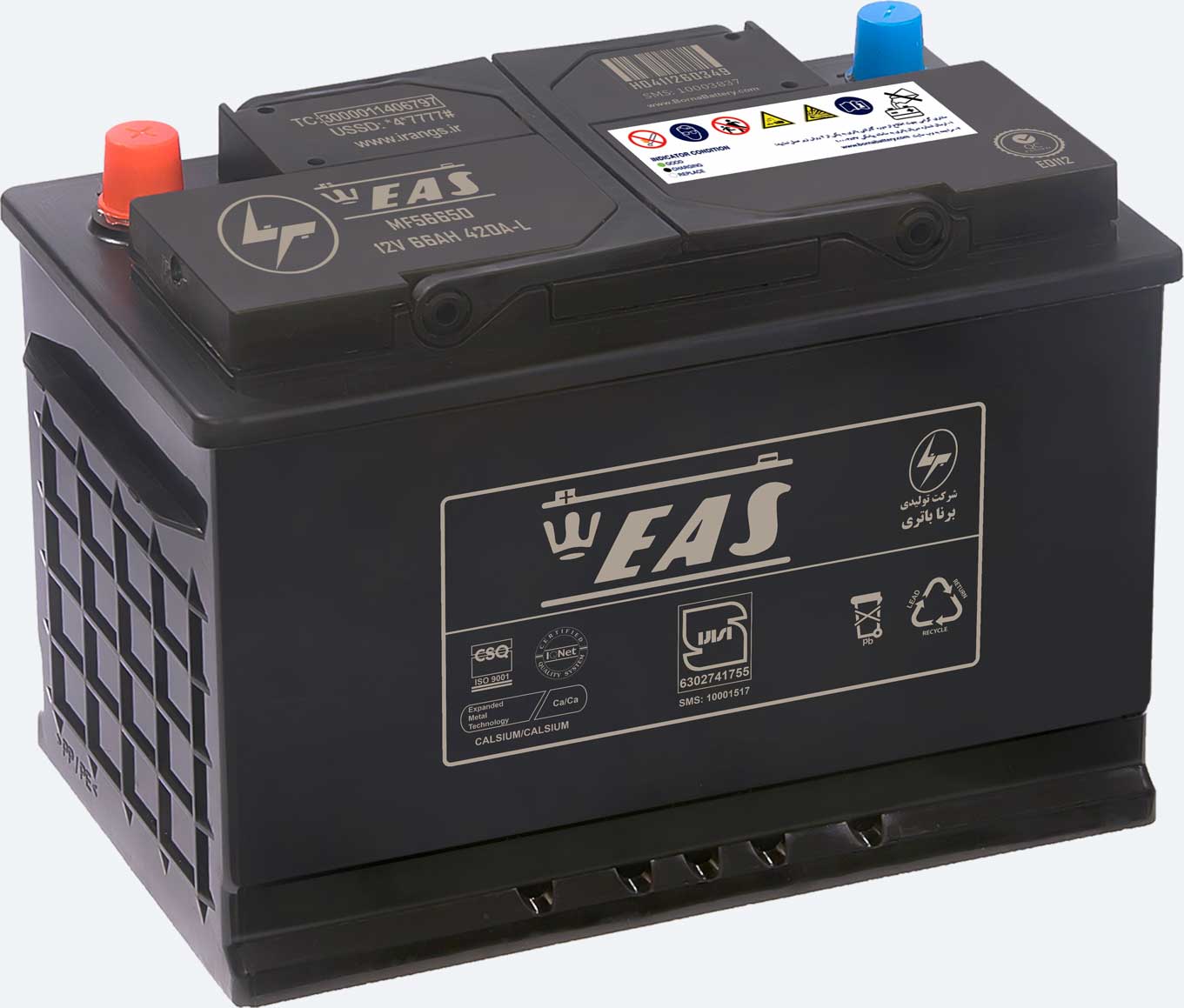 باتریهای 66 آمپر ایاس و برنا از نوع کوتاه با کنتاکت داخلی طراحی شدهاند. این باتریها دارای ابعادی به طول 27 سانتیمتر، عرض 17 سانتیمتر و ارتفاع 20 سانتیمتر هستند.